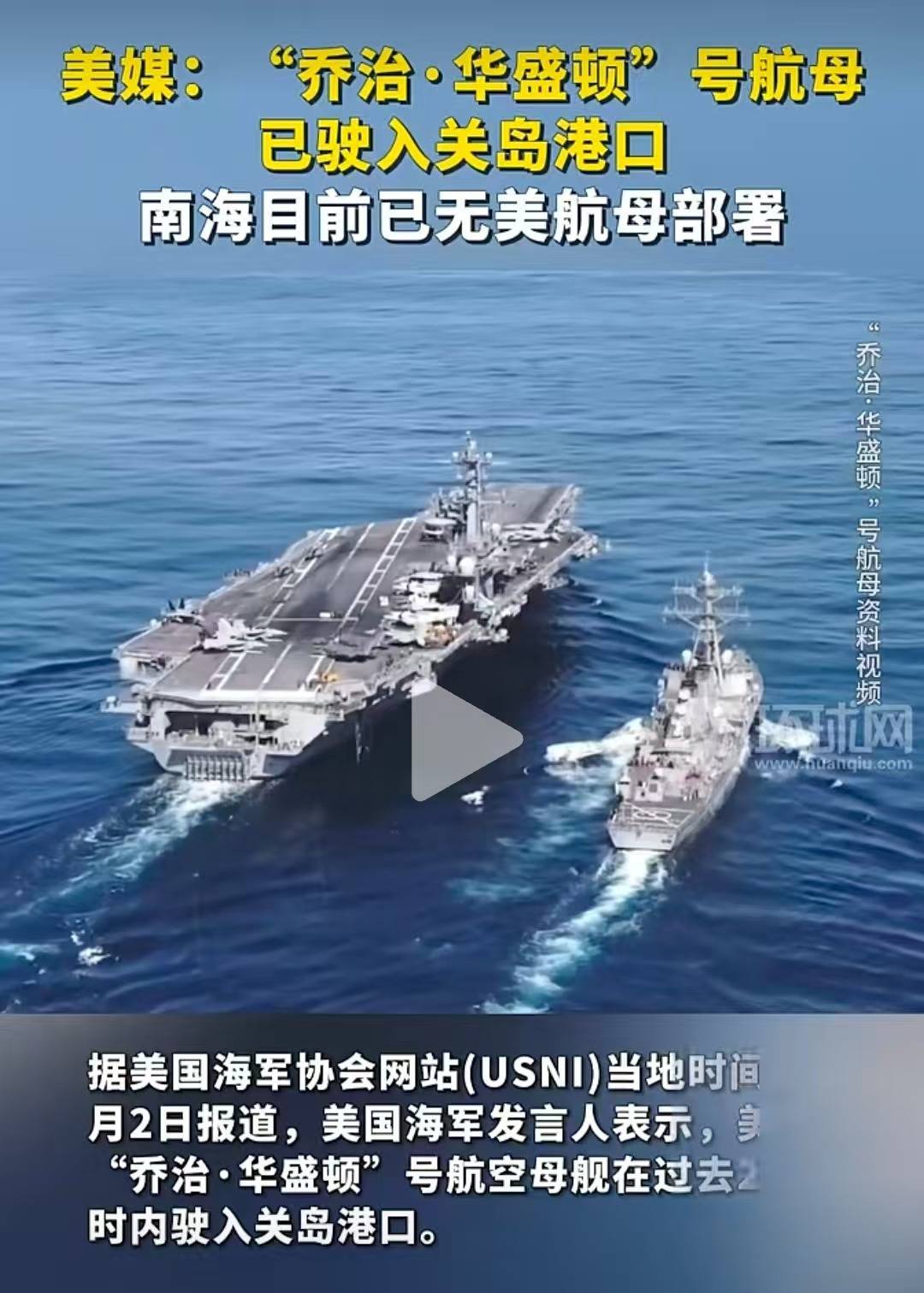 报道说,随着“乔治·华盛顿”号的离开,美国目前在南海没有部署航空母舰。