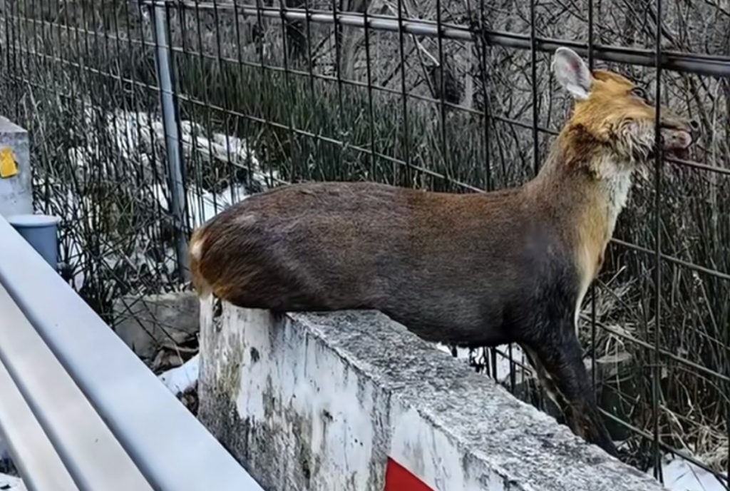 12月10日,一只野生麂子被卡在210国道秦岭段路边围网上,后被解救放生。