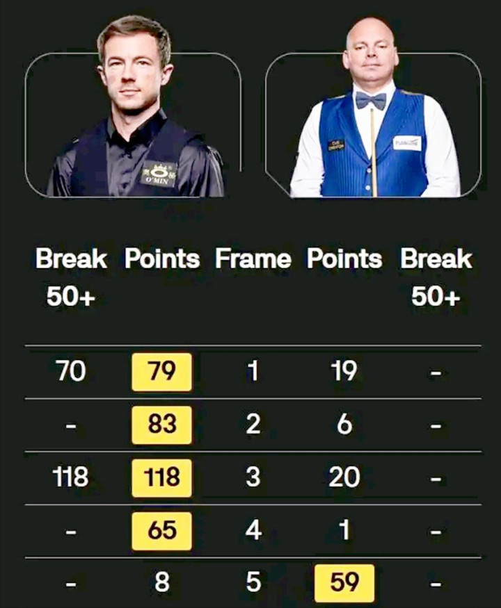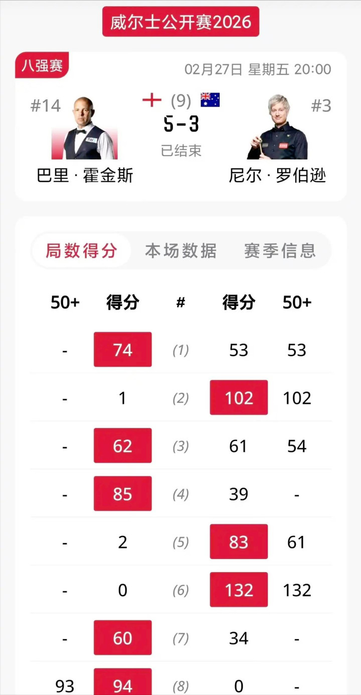 第一局,罗伯逊率先一杆53分,不过被霍金斯以74-53领先第一局;第二局,罗伯逊还击上手单杆102分破百清台,102-1把比分扳平;第三局,罗伯逊又打了一杆54分,眼看要反超比分;又被霍金斯以62-61完成单局逆转,只赢了1分!随后第四局霍金斯趁热打铁,比分拉开到3-1;中场休息回来,罗伯逊在第五局一杆61分,第六局更是一杆132分的超高破百,连追两局,硬生生扳成3-3平;第七局被霍金斯60-34艰难拿下;第八局霍金斯又直接一杆93分,5-3拿下比赛。